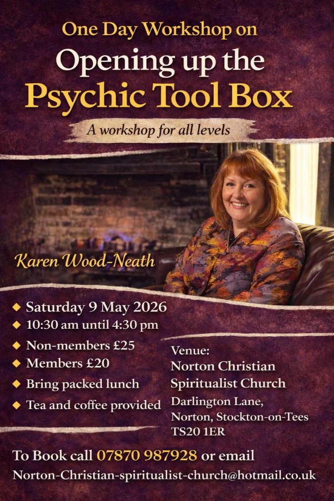 | Karen Wood Workshop Psychic Tool Box £20 Members £25 Non Members (Payment in full) | Sat 9th – 10am – 4pm | Church |